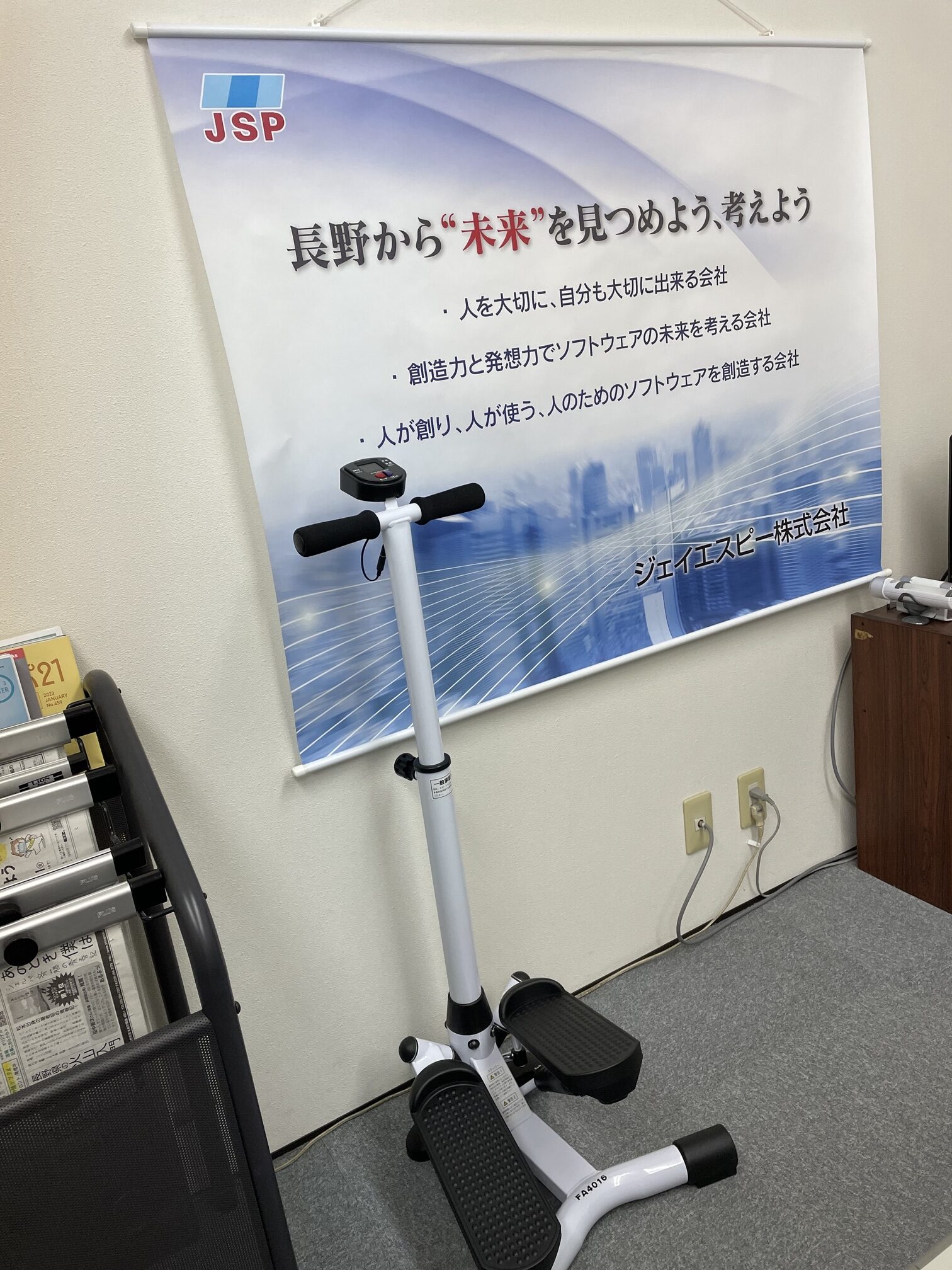 所属の健保組合(東京都情報サービス産業健康保険組合)からJSPの健康診断受診率100%の特典「ハンドル付きステッパー」が届き、4階会議室に設置をしました。